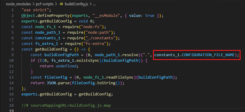 From there, I traced the configuration source to node_modules\pcf-scripts\constants.js, where the constant CONFIGURATION_FILE_NAME revealed that the settings are loaded from the project’s own pcfconfig.json. BINGO!.