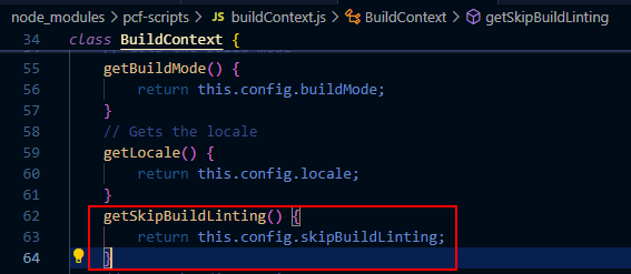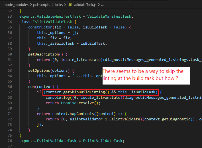 I figured out that the build context was defined in this file node_modules\pcf-scripts\buildContext.js, and found that getSkipBuildLinting() gets is value from a configuration switch. Getting closer…